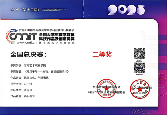 本次大赛汇聚了来自全国各个高校的省赛一等奖团队,参赛作品风格多样、创意十足,竞争激烈。我校美术学院学生许宝月在冯中强老师带领下,对作品《豫见千年——文物、古迹插画设计》精心筹备、打磨,最终成功闯入全国总决赛,获得二等奖。获奖作品将河南地域文化元素与版画艺术风格巧妙融合,既展现了深厚的文化底蕴,又具备前沿的创新思维,给评委和观众留下了深刻印象。