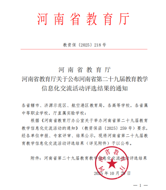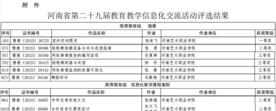 近日,河南省教育厅公布了第二十九届教育教学信息化交流活动评选结果。我校共有8项作品获奖,其中张俊飞获高等教育微课组一等奖,张青获高等教育微课组二等奖,孙夏卿、陈丹、张茜、马燕翔获高等教育微课组三等奖,张旖旎、杜文飞、张梦甜获高等教育信息化教学课程案例二等奖。