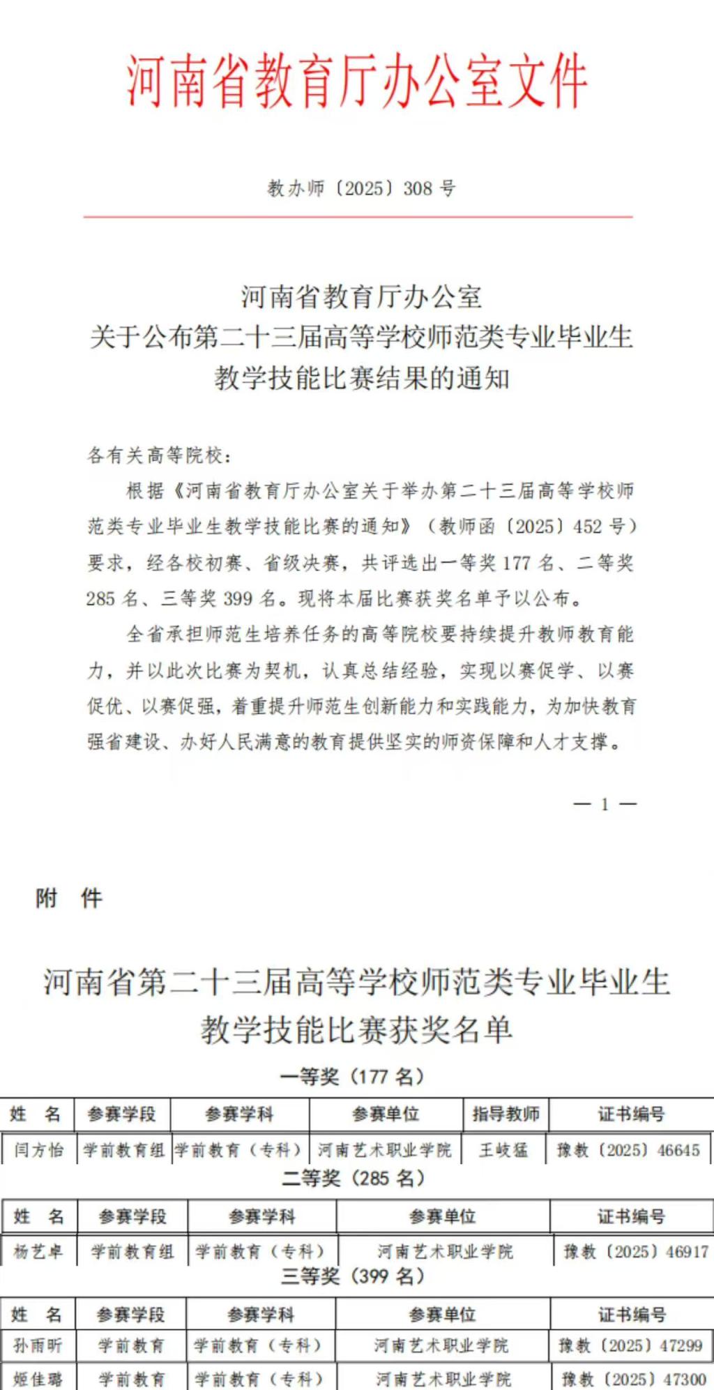 近日,河南教育厅下发《河南省教育厅办公室关于举办第二十三届高等学校师范类专业毕业生教学技能比赛的通知》(教师函〔2025〕452 号),我校师生获得1个一等奖,1个二等奖,2个三等奖。